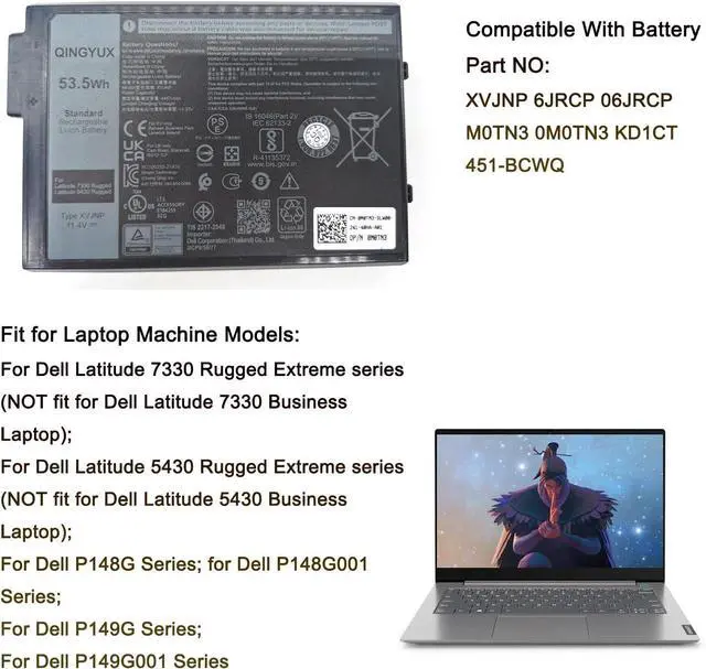 QINGYUX New XVJNP 6JRCP 06JRCP M0TN3 0M0TN3 KD1CT 451-BCWQ Laptop Battery Compatible with Dell Latitude 7330 Rugged Latitude 5430 Rugged P148G P148G001 P149G P149G001 Series Notebook