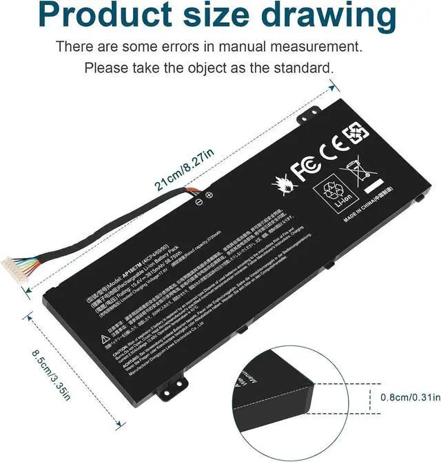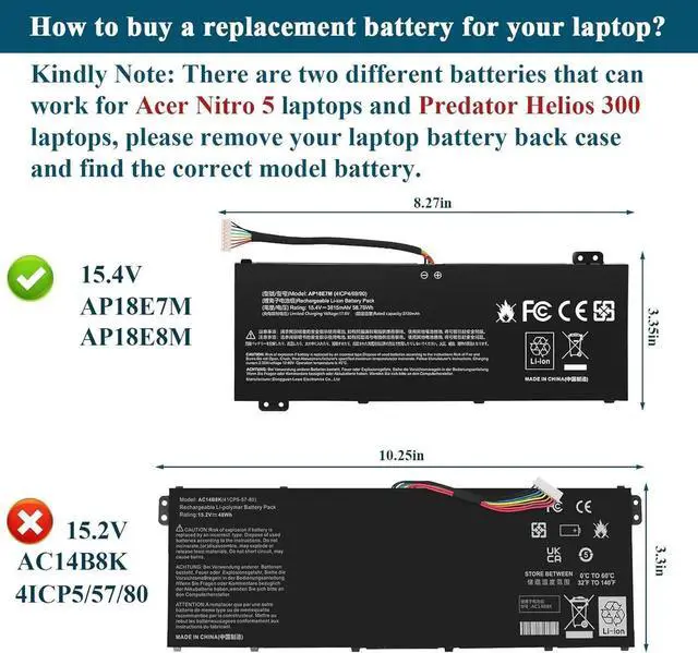 Attention!!! There are two different batteries that can work for Acer Nitro 5 laptops and Predator Helios 300 laptops, please remove your laptop battery back case and find the correct model battery. This product is relatively small in size, slightly smaller than the AC14B8K battery. Be sure to check your original battery and laptop model before making a purchase.