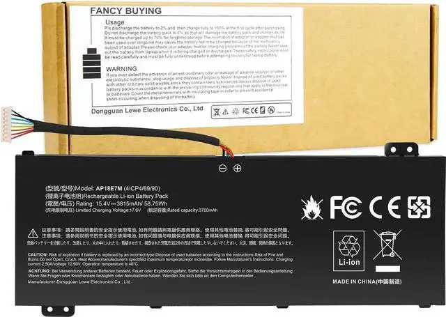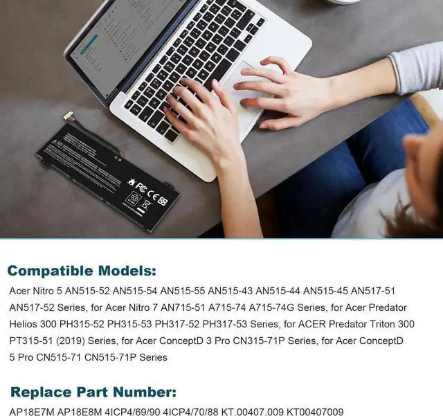 includes: 1x AP18E7M battery, with user manual for Acer Nitro 5 AN515-52 AN515-54 AN515-55 AN515-43 AN515-44 AN515-45 AN517-51 AN517-52 Series, for Acer Nitro 7 AN715-51 A715-74 A715-74G Series, for Acer Predator Helios 300 PH315-52 PH315-53 PH317-52 PH317-53 Series, for ACER Predator Triton 300 PT315-51 (2019) Series, for Acer ConceptD 3 Pro CN315-71P Series, for Acer ConceptD 5 Pro CN515-71 CN515-71P Series.