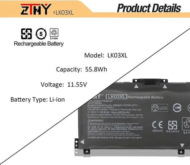 • Replace Part Number: 916368-421, 916368-541, 916814-855, HSTNN-LB7U, HSTNN-LB8J, HSTNN-UB71, HSTNN-UB7I, L08855-856, L08934-1B1, L09049-1B1, L09280-855, L09281-855, L09911-141, L09911-421, LK03048XL, LK03055XL, LK03XL, LKO3XL, TPN-I129, TPN-W127, TPN-W128