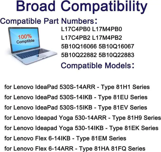 Compatible Laptop/Notebook Models forLenovo IdeaPad 530S 530S-14ARR 530S-14IKB 530S-15IKB 530S-14ARR-81H1 530S-14IKB-81EU 530S-15IKB-81EV Lenovo IdeaPad Yoga 530 530-14ARR 530-14IKB 530-14ARR-81H9 530-14IKB-81FQ 530-14IKB-81EK Series. Lenovo Flex 6-14IKB 6-14ARR 6-14IKB-81EM Series. LenovoXiaoXin Air 14IKBR, XiaoXin Air 14IWL, XiaoXin Air 15IKBR, XiaoXin Air 15ARR, XiaoXin Air 15IWL series