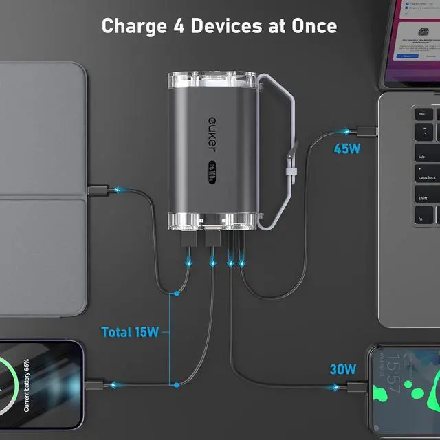 Equipped with a PD100W USB C1 port, PD30W USB C2 port, and 18W USB A1/A2 ports, supporting a maximum output of 100W, the Euker 100W portable power bank can charge four devices simultaneously, compatible with laptops, phones, iPads, and more devices with USB C/USB A ports, meeting all your charging needs.