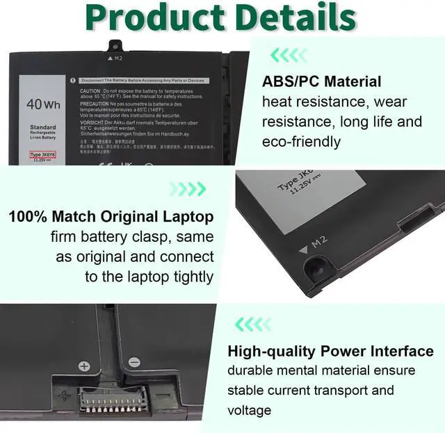 Specifications: Battery Model: 40Wh Standard Rechargeable battery Type JK6Y6, Voltage: 11.25V Capacity: 50Wh ; Cells: 3-cell; Color: Black ,Condition :New,Packages includes: 1x JK6Y6 Battery,2 x Screwdrivers,1x Instruction