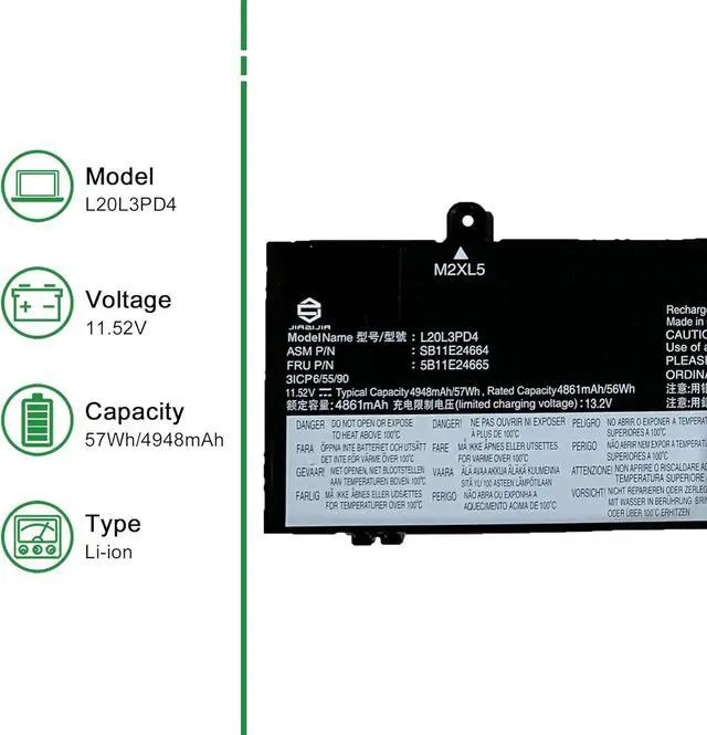 • Model: L20L3PD4 // Voltage: 11.52V // Capacity: 57Wh 4948mAh // Color: Black // Type: Plug & Play Li-ion Battery.