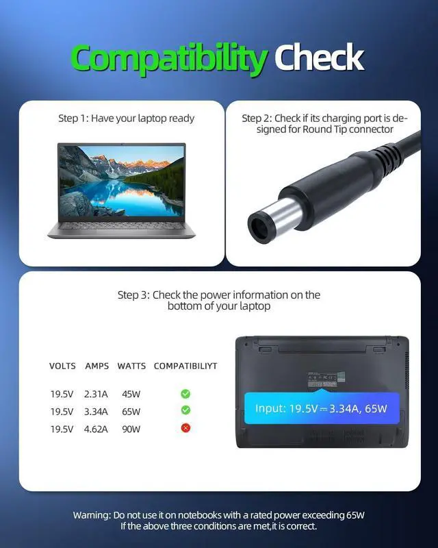 • Max Output Power: 65W 19.5V 3.34A,Connector Type: Round Tip