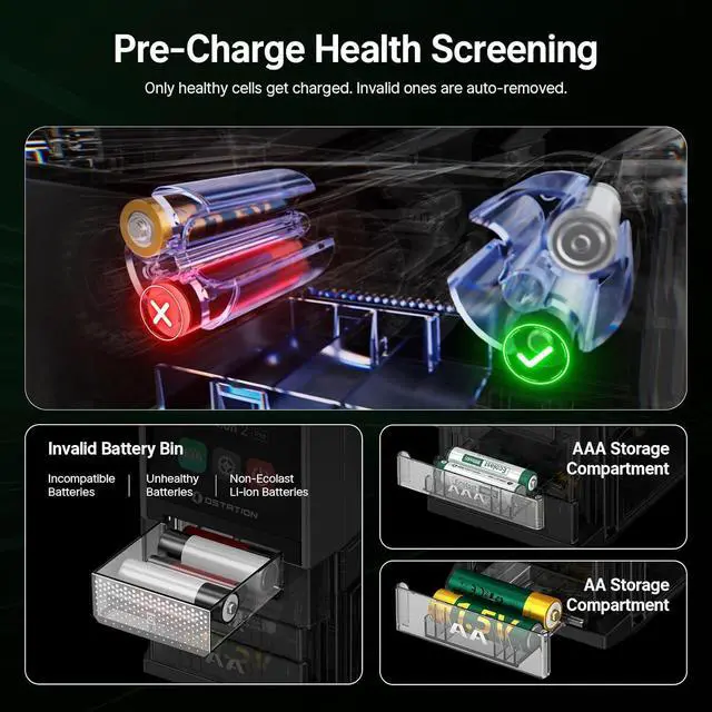 -, & : Leading-edge per-cell management system checks each battery before charging. Only healthy batteries charge, while incompatible or unhealthy cells are automatically removed. Saves time and prevents mix-ups