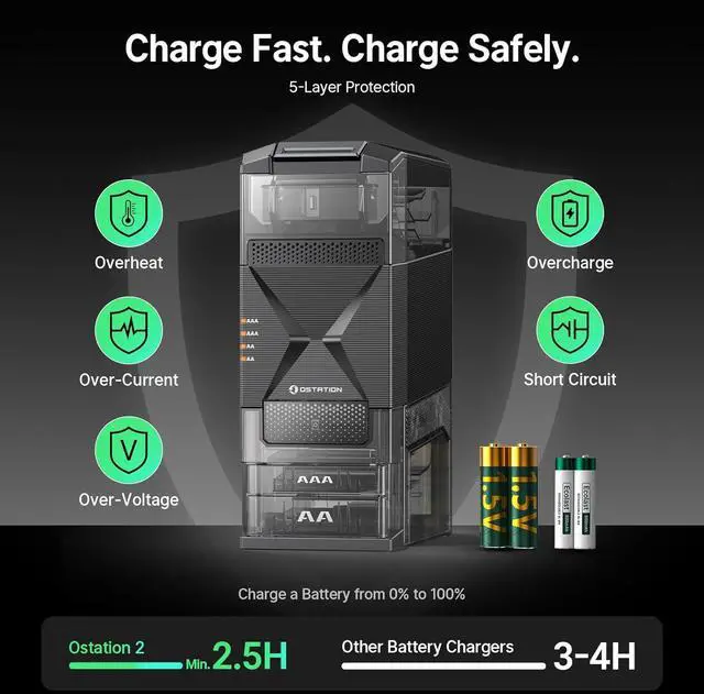 - : Safeguards against overcharge, overcurrent, overheating, overvoltage, and short circuits. Fully charges batteries in as little as 2.5 hours