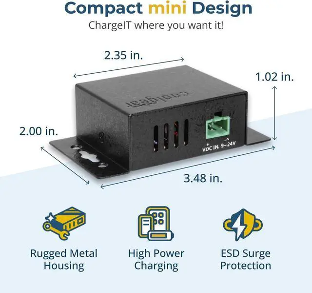 Superior Build Quality: Housed in a rugged metal chassis, the 2-port charger hub is perfect for installations in offices, labs, warehouses, classrooms, heavy machinery, automation equipment, and other industrial applications