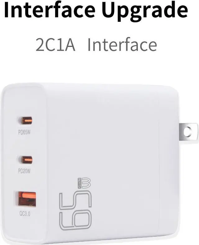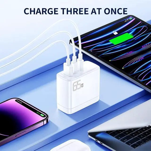 Smaller and lighter than traditional laptop chargers, this 65W travel wall charger saves space and can charge up to 3 devices at the same time, meeting the charging needs of a variety of devices and different scenarios, making it ideal for travelling.