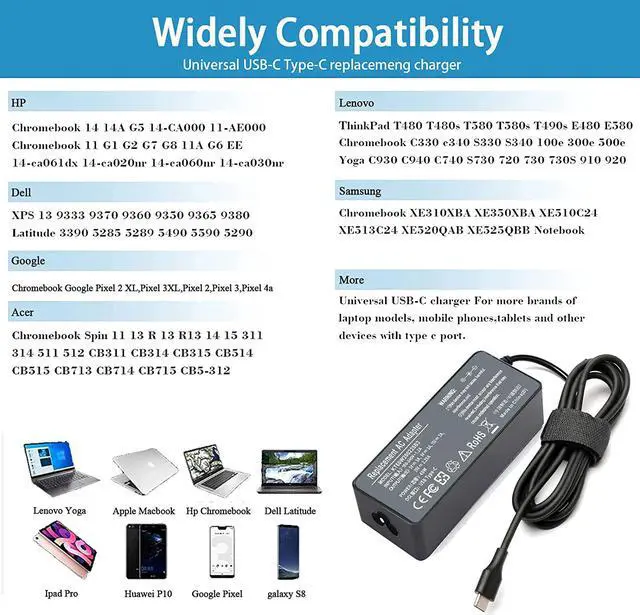 Compatible Models: 45w usb-c charger chromebook for Lenovo Chromebook 100e 300e 500e c330 c340 c340-11 c340-15 s330 s340 s340-14 touch s345 s540 c740 c940 s940 14w 14e S345-14AST; Flex 11 Chromebook; ThinkPad 13 Chromebook 2nd Generation; 11e Chromebook 4th Gen; for Dell Chromebook 3100 5190 3380 7486 P28T P29T P30T P86F P99G P100G P101G P110G P111G P28T002 P29T001 P30T001 P101G001 2-in-1 power adapter cord;