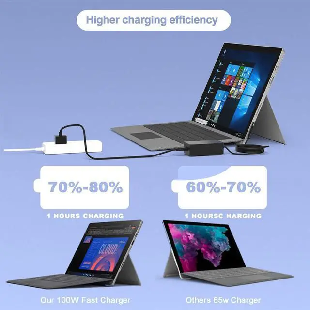 Microsoft Surface: 65W USB C Surface charger has a high charging efficiency of up to 100%. Full charge Surface Pro 8 in only 1.5 h, perfect match surface model 1706, 1866, 1796, 1724, 1625, 1867, 1735, 1800 and so on, Higher charging performance than 44W 39W 36W 24W laptop / tablet charger.