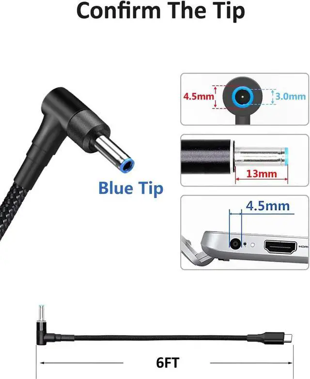 USB Type C to DC 4.5 x 3.0 mm ( 0.6 mm Pin ) Male Jack Plug Converter - 100W PD power charger cable replacement cord that can connect HP PC laptops to a PD AC adapters, 6.5 ft long distance is enough to connect devices while you are still charging in your bedroom, office or wherever you want.