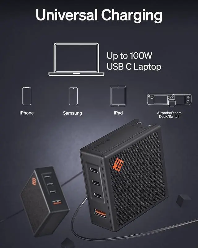 : The SlimQ 100W charger serves as a universal charging solution, efficiently powering a wide array of devices. From MacBook series, Dell XPS, HP Elite, YOGA, Google Pixelbook, Chromebook to iPhone and iPad, it provides seamless compatibility. It' s designed to work flawlessly with any laptop that has USB C power requirements of 100W or less. Please remember, for power delivery above 65W, use a 5A rated cable with an embedded eMarker chip.