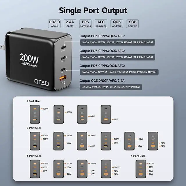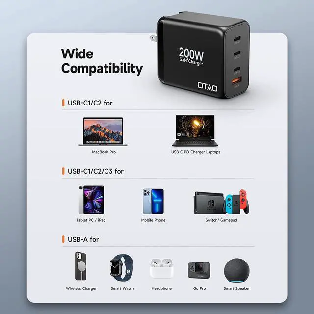 Wide Compatibility200W USB C Fast Charger Compatible with USB-A and USB-C phones, tablets, laptops, iPad Pro, Switch and more. Including macbook pro 16' ' /15' ' /14' ' /13' ', macbook Air 13', Dell XPS, HP, Google Pixelbook, Chromebook; iPhone 14 /14 Plus/14 Pro/14 Pro Max; iPhone 13/12/11 Pro/Pro Max, Samsung Galaxy, Pixel etc.