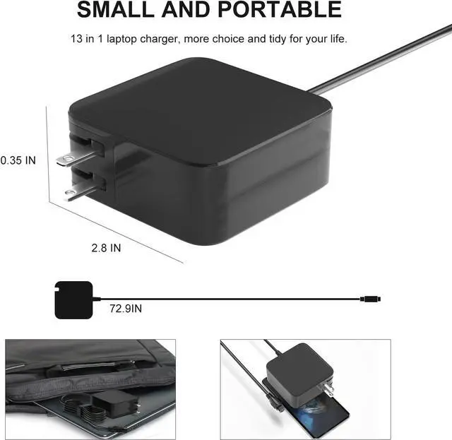 [Power Specs] Use universal laptop charger to power different brands of laptops Made with the latest GaN chip technology (smaller size, stronger power, 100W power volume is only 2.87 * 2.87 *1. 14) Have it to make your life more convenient and simple, 100W super power can support 90W 75W 65W 45W 65W 45W 40W 33W Laptop AC Adapter, Input: 100V-240V 50-60Hz