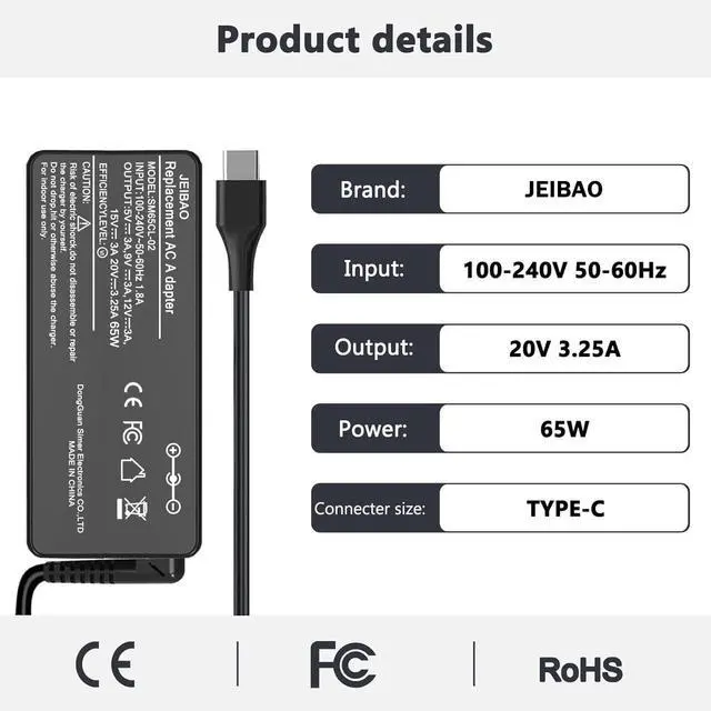 Wide Compatibility: JEIBAO 65W USB C laptop charger compatible with lenovo ThinkPad T14 T15 T16 E14 E15 E16 X1 Carboon X13 X270 X280 X380 A275 A285 A475 A485 T470 T470s T480 T480s T570 T580 T580s T490 T490s T495s T590 E14 E15 E480 E580 E485 E585 E490 E590 L480 L380 L390 L480 L490 L580 L590