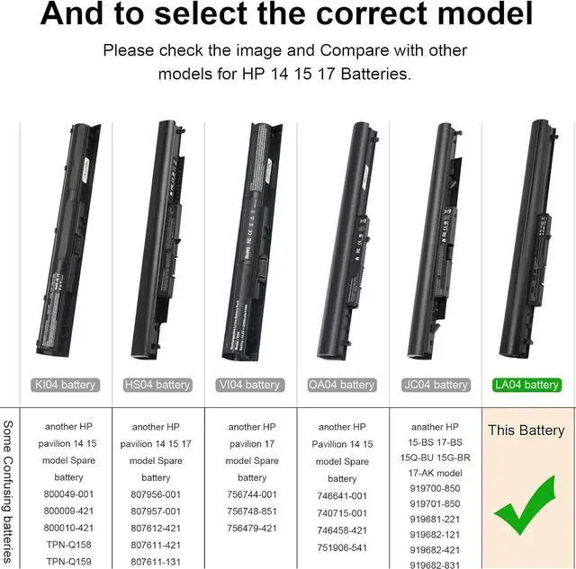 This laptop Battery works with HP Pavilion 14 15 Notebook PC series, HP 248 248 G1 340 340 G1 350 350 G1 Series, 728460- 001, 752237-001, 776622-001, 888182064801, 888793070383, F3B96AA, F3B96AA#ABB, HSTNN-IB6R, HSTNN-YB5M, J1V00AA, LA04, LA04041-CL, LA04041DF-CL, LA04DF, TPN-Q129, TPN-Q132