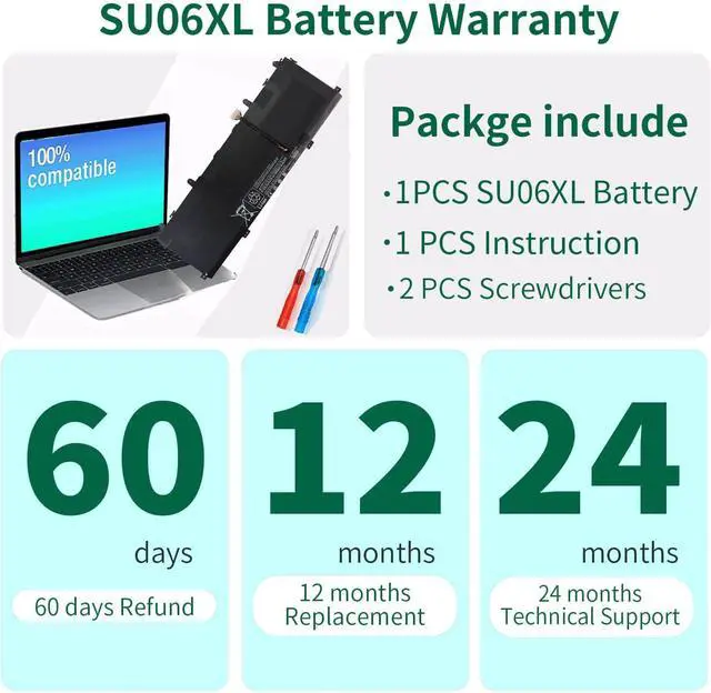 What You GetSU06XL Replacement Battery, 2 Screwdrivers, User Manual on Laptop Battery, We offer a 60-day return policy. For assistance with the SU06XL, please visit our product detail page.