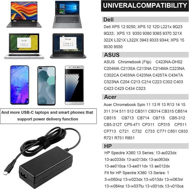 Compatible with: Dell Chromebook 3100 3500 3400 3300 3380 5300 5400 5500 7200 7300 7400 7486 5190 2-in-1 P28T P29T P30T P86F P99G P100G P101G P110G P111G P28T002 P29T001 P30T001 P101G001 2-in-1 Type C Laptop Charger Power Supply Cord.