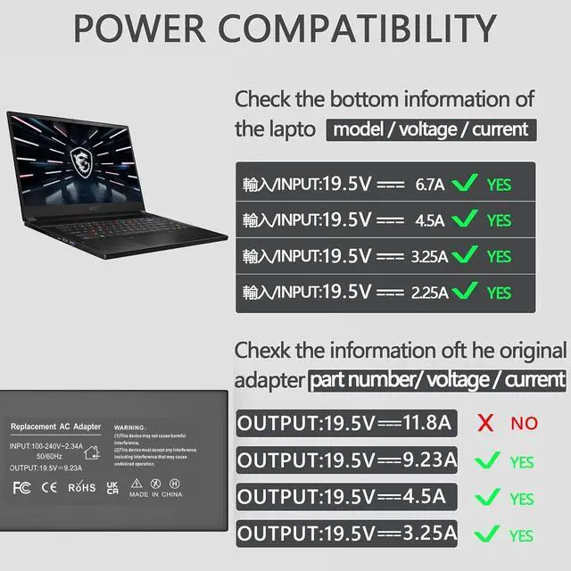 180W Laptop Charger: Compatible with MSI Gaming GX600 GX620 GX630 GX633 GX640 GX660 GX660R GX680 GX700 GX720 GX730 GX740 GX780 Prestige PE60 PE70 PX60 E7235 E7405 Workstation WS60 WT60 WT70; 7RD-1407 7RDX-1408 7REX-1896US 7RDX-800 Stealth-010 Stealth THIN-037 THIN-051 8RD-200 E7235-295US E7405-080US 0NC-006US 0NC-262US 0NC-498US 0ND-042US 0ND-257US 0ND-654MX 2OC-097US 2OD-247US 2OE-003US 2OE-073US Apache Pro-003 Apache-469 GE62 Apache Pro-219 APACHE-082 Apache-276 0ND-033US 0ND-213US 2OC-081US 2OE-017US 2OE-071US