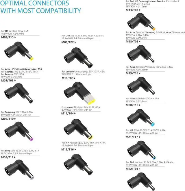 Output: 15V 16V 19V 19.5V 20V. Support 2.25A 2.31A 2.37A 3.25A 3.33A 3.34A 3.42A 3.5A 4.5A 4.62A 4.74A current. This universal laptop charger is prefectly compatible with 90w 65w 45w laptop chargers and adapters. (NOT for devices its power over 90W. )[Powerful Compatibility] This laptop charger comes with multiple popular high-quality tips fit for most HP IBM Toshiba Sony Fujitsu laptops ultrabook chromebook etc. It will work as long as there is a tip to fit your laptop. [Compatible with] HP ENVY 15 17 TouchSmart Sleekbook M6 M7 Stream 11 13 14 Spectre x360 DV14 15 2000 4000 5000 6000 8000 Pavilion Dv4 Dv6 Dv7 Dm4 G6 G7 Folio EliteBook Probook etc/ Inspiron 11Z-1121 1320 13Z-5323 14-3420 14Z-5423 15R-5520 15R-5537 14R 17R N5010 N7110 Studio 15 17 Xps Latitude Portege etc/ Thinkpad Z60 T410 SL400 SL500 SL510 Ideapad yoga 2 pro 11 11s 13 etc/ Chromebook 11 13 14 15 C720 C720P R11 C740 Cb3 Cb5 Aspire P3 S5 S7 E5-573G E1 ES1 Travelmate etc. [Compatible with] Zenbook UX21E and UX31E Chromebook C200 C200MA C300 C300MA X553M T300LA F553M VivoBook etc/ Toshiba Chromebook 2 13.3 inch CB30 CB35 Satellite C55-C5241 P755 P775 P870 S855 S875 U305 U505 etc/ X551MA F555LA-AB31 X550ZA-WH11 X551 X555LA K501UX etc/ AtivBook GS6/GT6/7/8 X05 VM GT NT etc/ Sony VAIO VGP-AC19V39 VGP-AC19V47 etc/ Fujitsu Lifebook etc/ Gateway NV55C etc.