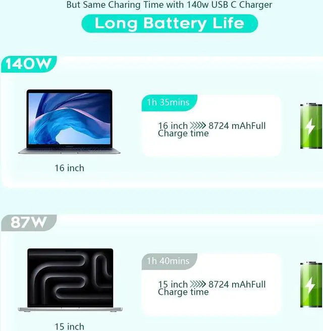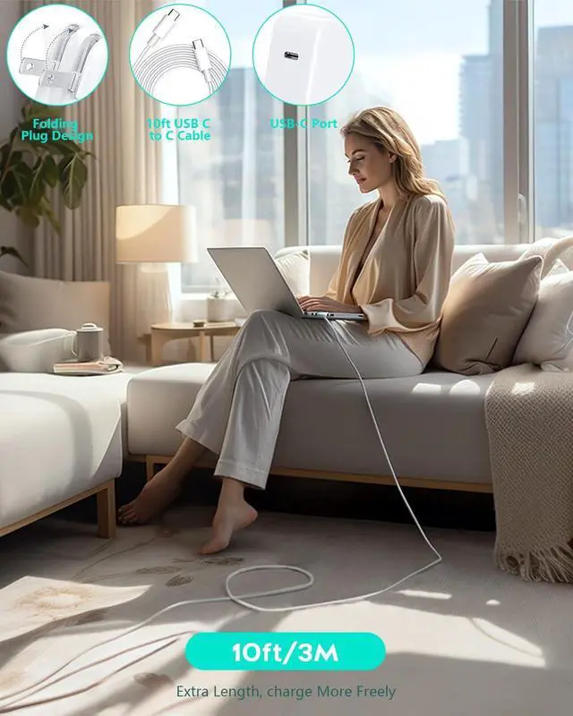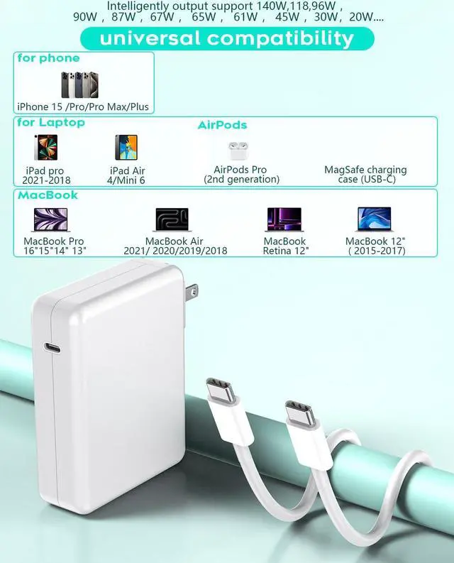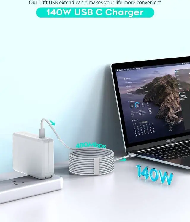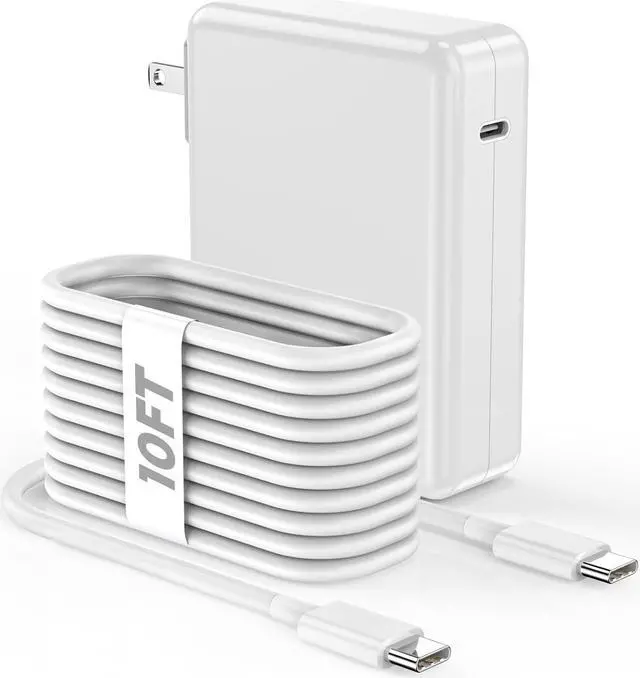 intelligently output support 140W 118W 96W 87W 70W 67W 65W 61W 45W 30W 20W and provide higher charging performance at the mean time.??? Multiple Security Protection Our 140W/118W/96W macbook laptop charger adopts the most advanced technology and is made of the highest quality materials. Smart chip is installed inside include multiple smart features safeguarding against over-current over-voltage overload temperature protection short-circuit protection and auto recovery fast charging speed and long service life.??? 10 feet USB C to USB C Cable by MFi Certification The 10FT Macbook Cable protect the charging port of your expensive device from damage made of top-rated thicker copper wire and coated with premium soft-touch TPE tested with over 30000+ times bend to provide 4 times longer lifespan let you can charge and have fun anywhere support 480Mbps data syncing between your phone and laptop.
