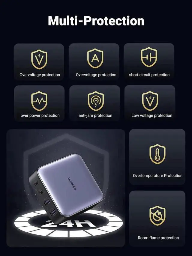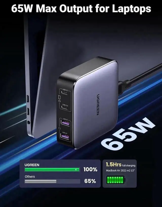 Special Feature 2*USB Type A & 2*USB Type C, 65W Fast Charging, GaN Tech, Lightweight Design