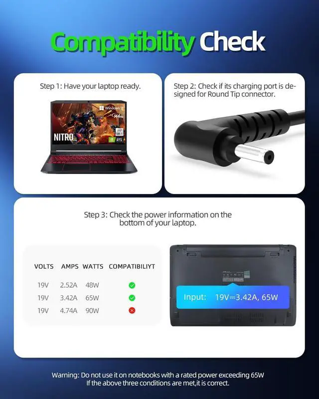 Output Max - 19V 3.42A 65W, compatible with 19V 2.53A 48W Input Volt Range - 100-240V