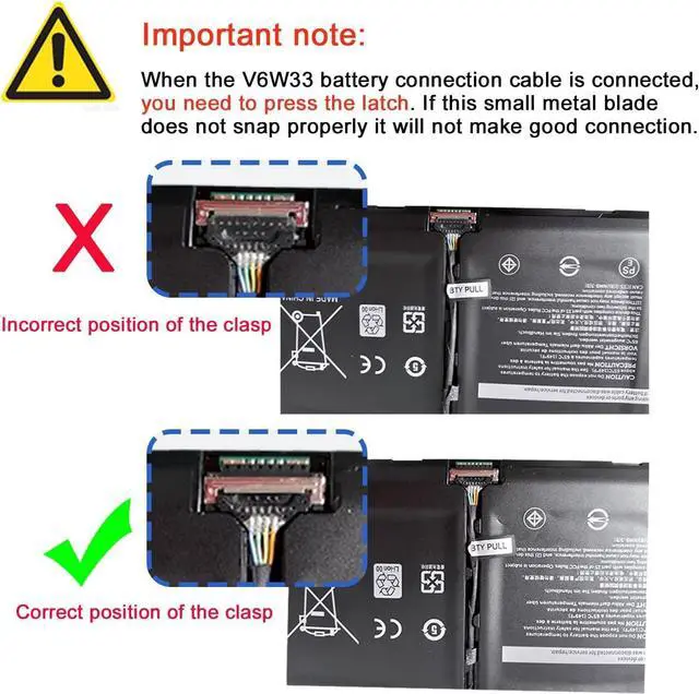 JGCCT(Note: When the V6W33 battery connection cable is connected, you need to press the latch. If this small metal blade does not snap properly it will not make good connection. )