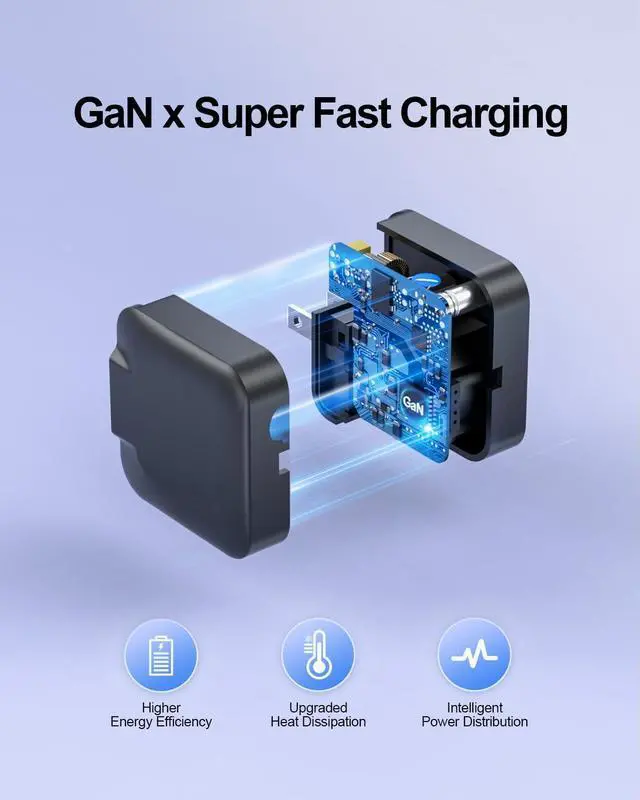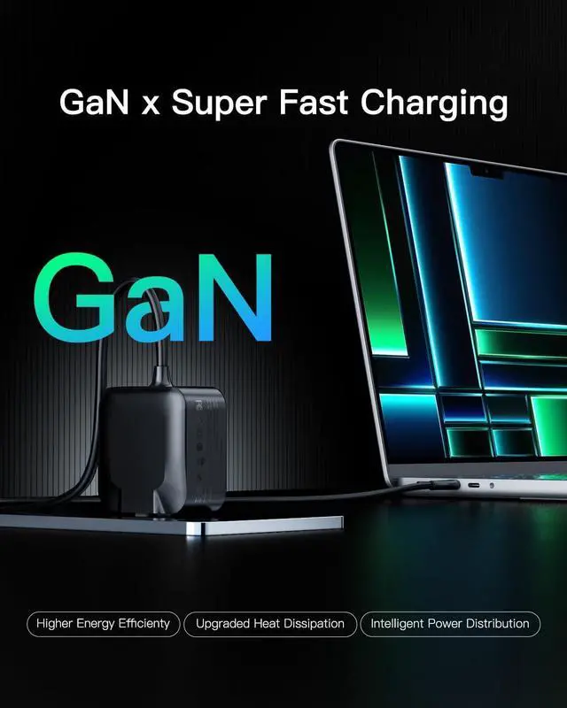 Fast Charging Speed Meets Efficiency: Equipped with GaN and PD technology, the 65W charger delivers blazing-fast charging with intelligent power distribution and improved energy efficiency, generating less heat and keeping your devices cooler during use.