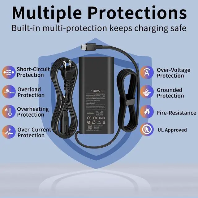 FeaturesDell Laptop Charger USB C 100W Designed for durability, Dell 100W Laptop Charger USB C' s connector withstands frequent plugging/unplugging, ideal for travelers. The 11FT cable offers flexibility. Certified by CE/FCC/ROHS/UL, 100W USB C Laptop Charger ensures safety with advanced protection against overcharging and overheating. Its ultra-slim design makes it easy to carry, perfect for on-the-go use