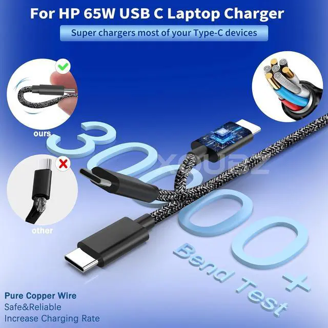 Output: 5V 3A /9V 3A /12V 5A /15V 4.33A /20V 3.25A, MAX Power 65W (Compatible with 45W HP Computer Charger USB C);