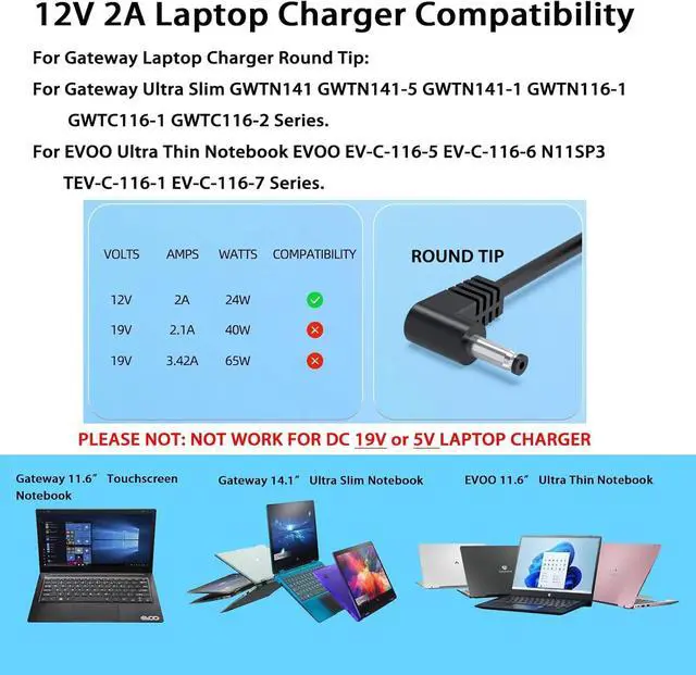[DC 12V Laptop Power Cord Compatible with Gateway Charger: ] Fit for DC 12V Gateway GWTN133-1 GWTN133-1BK GWTN133-1BL, GWTN141-1 GWTN141-1BK GWTN141-1BL GWTN141-1GR GWTN141-1PR, GWTN141-5 GWTN141-5BK GWTN141-5BL GWTN141-5GR GWTN141-5PR, GWTN156-11 GWTN156-11BK GWTN156-11W, N11SP3, saw30-120-2000u Laptop. for 12V EVOO EV-C-116-5 EV-C-116-6 N11SP3 TEV-C-116-1 EV-C-116-7 evoo laptop.