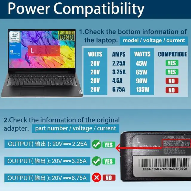 Product DescriptionOutput & Wattage: 20V- 3.25A 65W (Works with 20V- 2.25A 45W laptop)