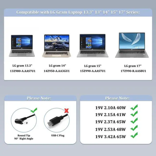 [Compatible Models] This 65W Laptop Charger compatible with LG Gram Laptop 13Z950, 13Z970, 13Z970-A. AAS5U1, 13Z975, 13Z980, 13Z980-U. AAW5U1, 13Z990, 13Z990-A. AAS7U1, 13Z990-R. AAS7U1, 14Z950, 14Z970, 14Z970-A. AAS7U1, 14Z980, 14Z980-U. AAW5U1, 14Z990, 14Z990-R. AAS7U1, 14Z990-U. AAW5U1, 15Z960, 15Z970, 15Z970-R. AAS9U1, 15Z975, 15Z980, 15Z980-R. AAS9U1, 15Z980-U. AAS9U1, 15Z990, 15Z990-A. AAS7U1, 15Z990-R. AAS9U1, 17Z90N-R. AAC8U1, 17Z90N-V. AA55A8, 17Z990, 17Z990-R.