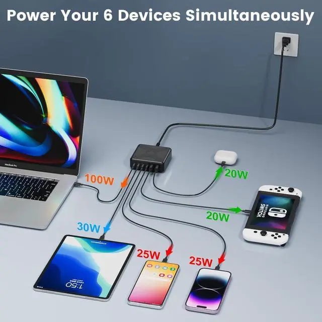 Fast Charger - 220W usb c charging station with 6 ports. USB-C1 is 100W it can quickly charge your laptop or tablet such as MacBook Pro 13''/ MacBook Pro MacBook Air MacBook iPhone iPad Mini iPad Pro iPad Air MacBook Pro 13''/ MacBook Pro MacBook Air iPhone iPad Mini iPad Pro iPad Air etc. It allows you to charge quickly and get the best use in a short time. MULTIPLE PROTECTION & SAFE CHARGING - The usb c charger is ensure 100% protection for your device. The usb c chargers protect your device from excessive current overheating and overcharging.