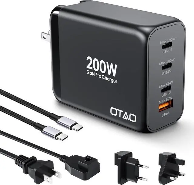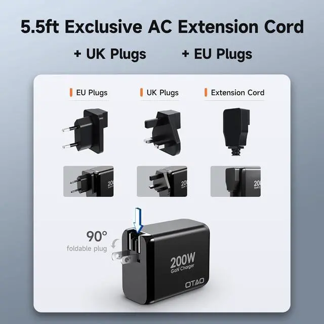 What You Get: A 200W GaN Wall charger A 5ft AC Power Cord A UK Plug A EU Plug A Instruction.