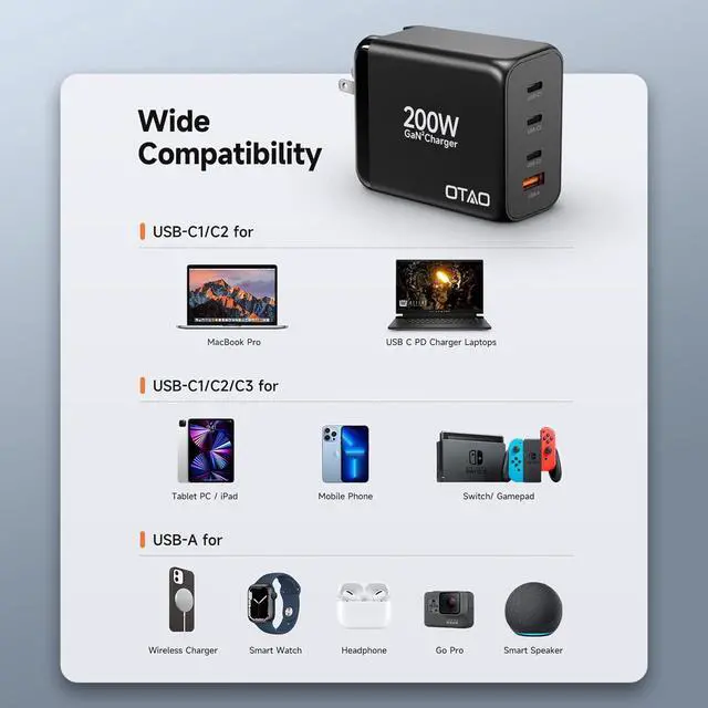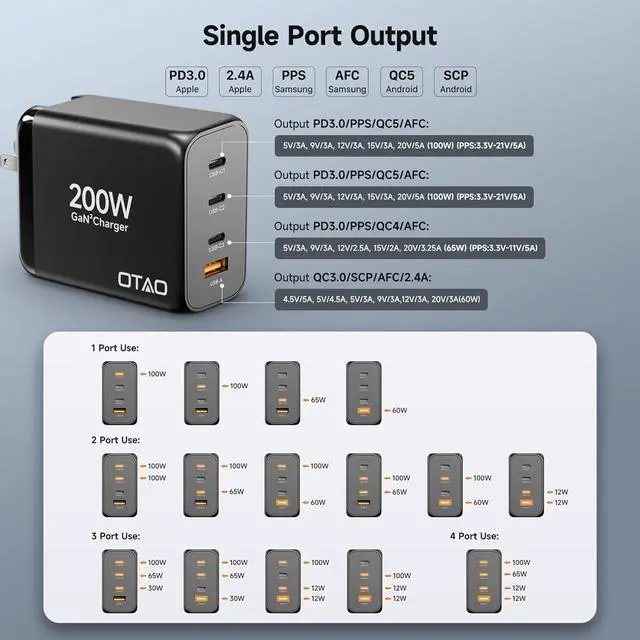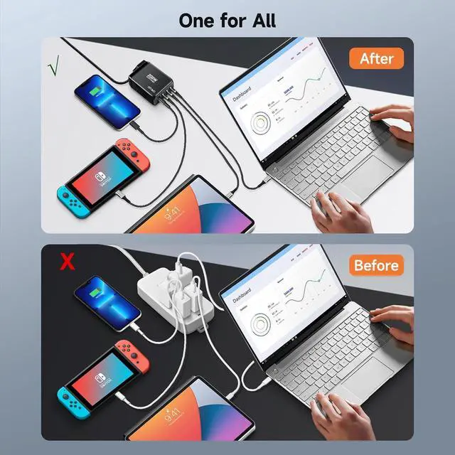 Output: This GaN charger delivers a total of 200W providing rapid and efficient charging for all your devices. And supporting 100W+100W fast charging power for two laptops at the same time fully charged in about 1 hour. All the devices includes laptop tablet smartphone and other gadgets can enjoy quick and reliable power. Charging Station for Multiple Devices with