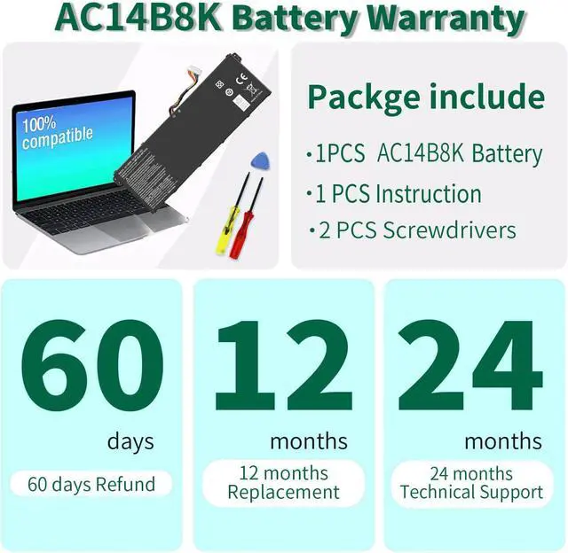 Battey model: AC14B8K; 60 Days Money Return 12 Months Replacement2 Years Tech Assistance