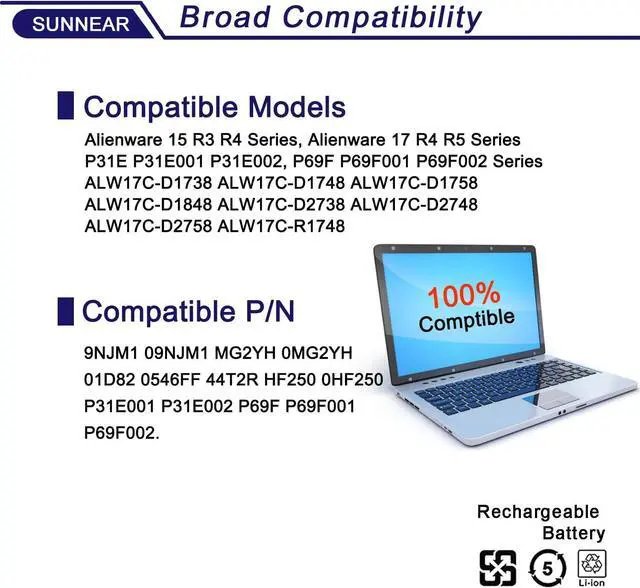 Compatible Laptop/Notebook Models for Dell Alienware 15 R3 R4 Series, 17 R4 R5 Series Notebook, Dell P31E P69F Series(P31E001, P31E002, P69F, P69F001, P69F002 Series), Dell ALW17C Series. (Dell ALW17C-D1738 ALW17C-D1748 ALW17C-D1758 ALW17C-D1848 ALW17C-D2738 ALW17C-D2748 ALW17C-D2758 ALW17C-R1748 Series)