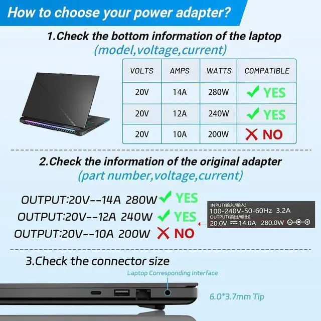 Output: 20V 14A Max (280W) (compatible with 240W 230W 180W Not Fit 20V 16.5A 330W)Connector