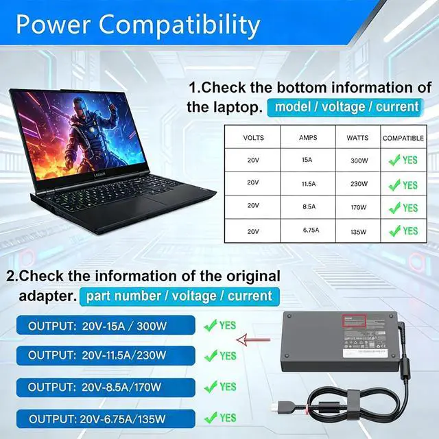 Compatible Models: 300W 20V 15A Charger Compatible with Legion R9000P R9000K Y9000K Y9000X R7000P 9000P 9000K charger Compatible with Legion Pro 9i 7i 7 RTX 3050 3060 3070 RTX 4070 series; Legion 5 5i 16IRX8 16IRX9; Legion Pro 7i 16IRX8H 16IRX8; Legion Pro 7 16IRX8H 16IRX8 4070 4080 4090; Yoga AIO 7-27ACH63.