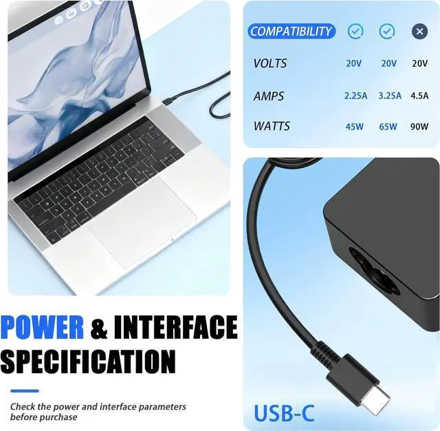 Watts: 65W(Compatible with 60W 45W USB-C Charger)Safety Engineered & 12-Month