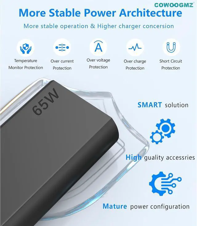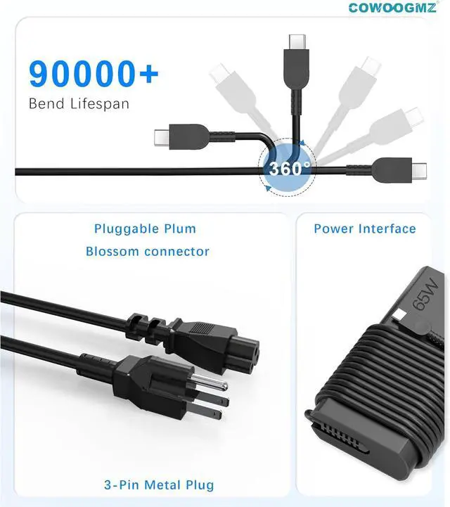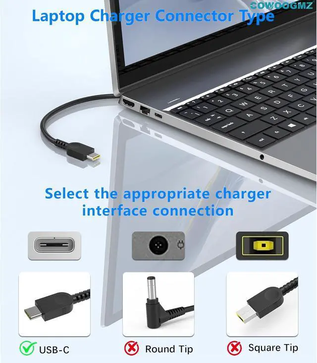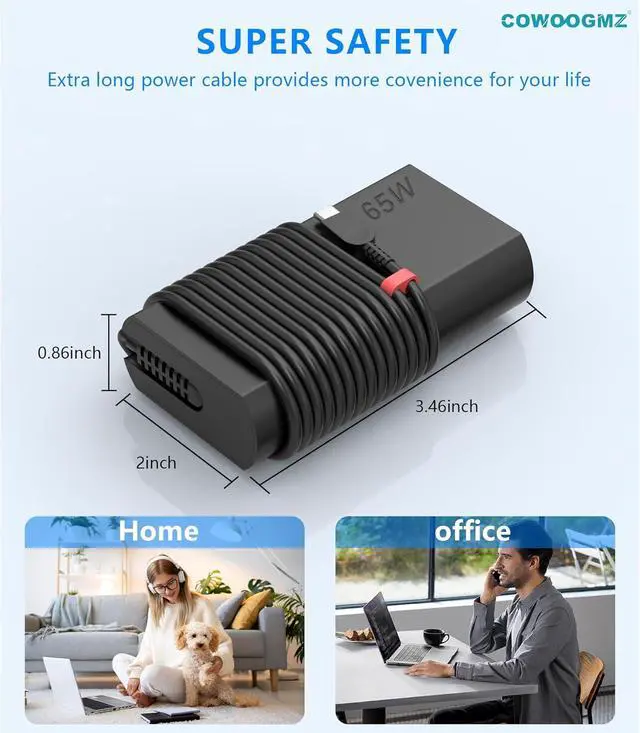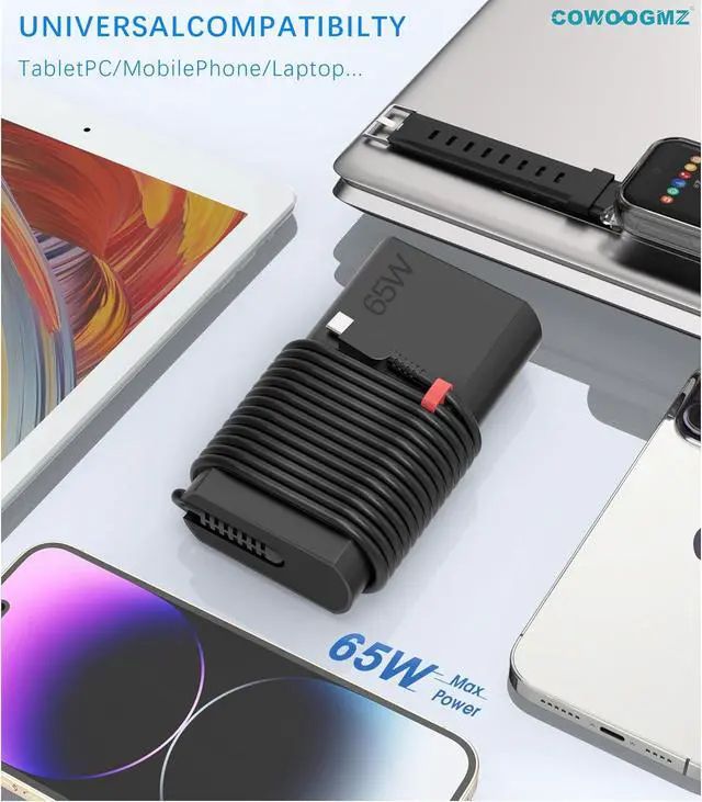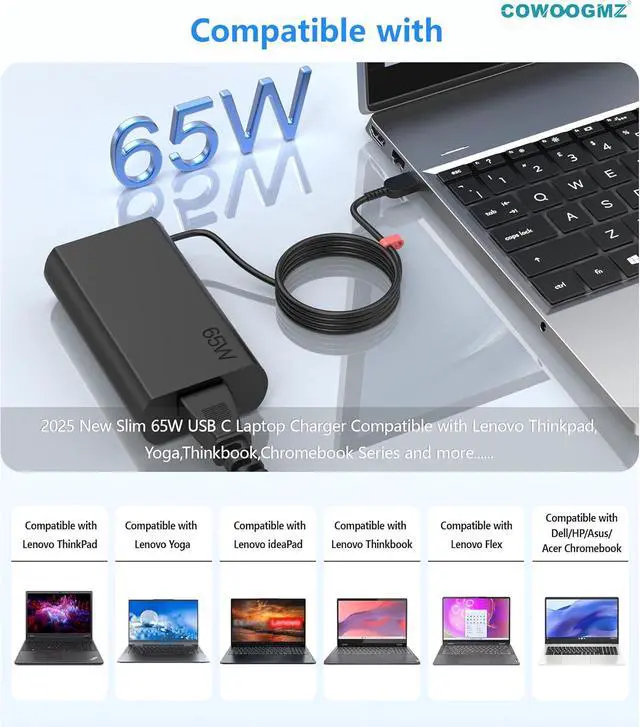 Connector Type: USB-C/Type C Compatible with 65W 45W USB C Computer ChargerCOWOOGMZ 65W USB C Laptop Charger Compatible with ThinkPad X1 X1 Fold X1 2-in-1 X12 X13 X13 Yoga X13 2-in-1 L13 L13 Yoga L13 2-in-1 T14 T14s T16 L14 L16 E14 E16 Z13 P14s P16s C14 Compatible with ThinkPad T480 T480s T580 T580s T490 T590 E480 E580 E585 E490 E590 L480 L580 P51s P52s P43s P53s X270 X280 X380 X390 X395 Compatible with ThinkBook 13s 13x 14 14s 15 Plus Gen 4 Series NotebookCOWOOGMZ 65W USB C Computer Charger Compatible with Yoga 7i 9i 14 15 2 in 1 Yoga S730 C930 C940 C740 730 730S 910 920 720-13 730-13 730s-13 s730-13Y 920 S730 C930 910-13IKB 920-13IKB C930-13IKBP720-13IKB 730-13IKB 730S-13IWL 730S-13IML S730-13IWL S730-13IML Compatible with Chromebook 100e 300e 500e 300w 500w C330 C340 S330 S340 S345 14W 13w 14e Gen 1 2 3 4 Series NotebookCompatible with Laptop Part Number 4X20E75131 4X20M26252 4X20M26268 4GX20N20876 4X20E75132 4X20E75135 4X20V07881 4X20E75137 GX20P92530 ADLX65YLC2D ADLX65YLCC2D ADLX65NCT2A ADLX65YCC2D ADLX65YDC2D ADLX65YLC2A ADLX65YCC3A ADLX65YDC3A ADLX65YDC2A ADLX65YLC3A ADLX65YDC3D ADLX65YCC3D ADLX65YLC3D ADLX65YAC3A ADLX65YCC2A ADLX65YAC2A ADLX65UCGU2AUltimate Device Protection: Equipped with upgraded safety technology that continuously monitors temperature voltage and current to prevent overheating over-voltage over-current and short circuitsensuring your laptop stays safe while charging at full 65W speedPackage 1x AC Power Adapter & 1x AC Power Cable & 1x User Manual