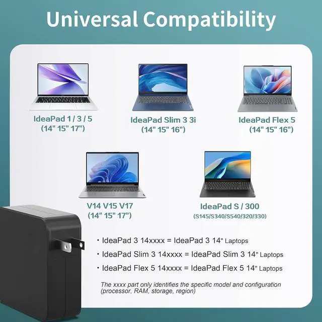 Plug Fit: Round Tip Only Fit for IdeaPad 1/3/5 IdeaPad Slim 3/3i Flex 5 V14/V15/V17 S145/S340/S540 320/320S/330/330S. Not compatible with USB-C charging laptops. Please Confirm Plug Type. Safe Fast & Reliable for Laptop Charger AC adapter delivers precise 65W/45W (20V) power for fast stable charging with intelligent multi-protection against overcurrent overvoltage short circuit and overheating. Built with premium copper core wiring and a compact lightweight design its a durable portable replacement charger for home office and travel. Energy Efficient & Eco-Friendly for Laptop Charger Smart power management reduces energy waste while delivering stable power protecting your laptop battery during home office or travel use. Durable & Travel-Friendly for Laptop Charger Built with reinforced copper core wires premium connectors and an extended flexible power cable for long-lasting use and easy connection to outlets at home office or while traveling compact and lightweight for carrying in your laptop bag. Reliable Replacement for Laptop Charger Charger for laptop comes with professional after-sales support and responsive customer service replacement AC adapter for laptop providing peace of mind for everyday use office work or travel