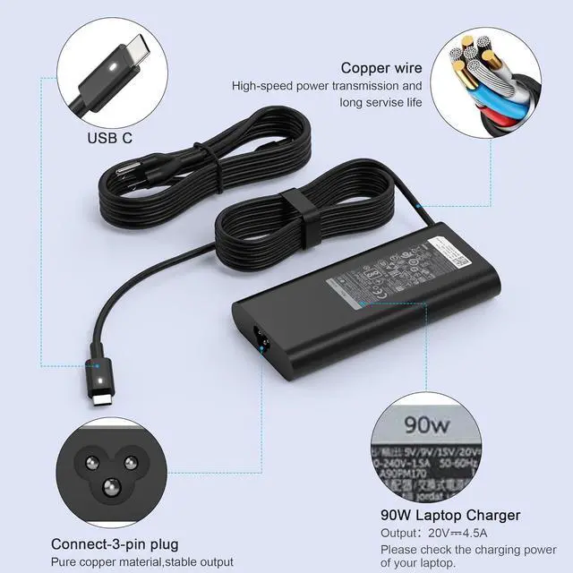input: 100V-240V 50-60Hz. Output20V/ 4.5A 20V/ 3.25A 20V/3A 20V/ 2.25 With the latest USB-C and PD 3.0 technologies the correct power output is automatically detected and deliveredYUERYE 90w usb c Charge Compatible with XPS 12 9250 XPS 13: 9350 9360 9365 9370 3943 9333 9344 XPS 15 9500 9510 9520 XPS 17 9700 9710 9720 Chromebook 31002 in 1Precision 3540 3541 3571 3570 3550 3450 3470 5550 5470 5750 Inspiron 14 Plus 7420YUERYE 90w laptop charger Compatible with Latitude 3150 3400 3500 5289 5300 5400 7300 5300 2in1 7200 2in1 7400 2in1 7390 2in1 Inspiron 7501 Inspiron 7506 2-in-1 Inspiron 7791 2-in-1 Inspiron 14 Plus 7420Compatible with P/NTDK33 0TDK33 0Y2XGV 0M1WCF 0JYJNW 02CR08 002YK0F 0K00F5 0M0H25 HA65NM170 LA45NM150 LA65NM170 PW7015MC DA65NM170 HKA30NM150what you get