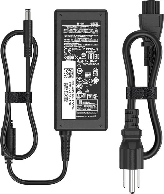 Direct replacement for P/N: MGJN9 G6H45 LA65NS2-01 HA65NS5-00 PA-1650-02D A065R073L. [Certified Safety Protection]. Built-in smart chip provides multi-protection against over-voltage over-current short-circuits and overheating. Includes a heavy-duty 5FT AC power cord.