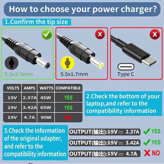 You Get: 1x65W toshiba satellite Laptop Charger Replacement 1x Power Cord We offer a 60-day return policy. For assistance with the toshiba satellite laptop charger Power Cord Supply please visit our product detail page.