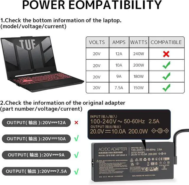 TUF Series: Fit for TUF Dash F15 FX516QR FX516PM FX516PR FX516P FX516PC FX516PE FX517ZR FX517ZM FX517ZC FX517ZE FX507ZE FX507ZC FX507ZC4 FX506HM FX506HC FX506HE FX506LU FX506HEB FX506HCB FX506IV FX506IU FX506II FX506IH FX506HF FX506LH FX506LI FX506H FX506L; TUF F17 FX766 FX766LI FX706 FX706HC FX706HCB FX706HE FX706HEB FX706IU FX706HM FX706HF FX706LI FX706LH Gaming Laptop AC Adapter Power Supply Cord3Compatible with