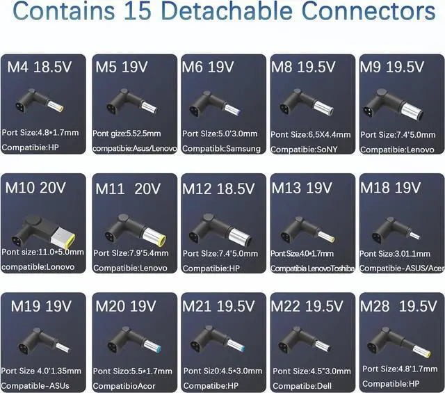 Wide Compatibility: This universal laptop adapter comes with 15 interchangeable tips making it suitable for most laptops ultrabooks and Chromebooks. It is compatible with IBM Sony Fujitsu Gateway and more. As long as your laptops connector matches one of the 15 included tips this adapter will work perfectly for you. The QFA Universal Laptop Charger is widely compatible with top laptop brands including (ENVY 17/15 TouchSmart Sleekbook M6/M7 Stream 11/13/14 Spectre x360 Pavilion DV4/DV6/DV7/DM4/G6/G7 DV14/15 2000/5000/6000/8000 Folio EliteBook ProBook) (Inspiron 11Z/1320/13Z/14/14Z/15R/14R/17R/N5010/N7110 XPS Latitude Studio) (ThinkPad Z60 T410 SL400/SL500/SL510 Ideapad Yoga 2 Pro/11/11s/13) (Chromebook 11/13/14/15 C720/C720P R11 C740 CB5 Aspire P3/S7/E5/S5/ES1 TravelMate) and many more. With broad device compatibility and reliable performance its the perfect replacement adapter to keep your laptop powered anytime anywhere. The QFA Universal Laptop Charger is designed for broad compatibility supporting Aspire series (E 15 E5-575-33BM A114-31-C4HH E5-575G-57D4 CB3-131-C3SZ CB3-131-C8GZ CB3-431-C5FM CB3-532 CB5-571-C09S P3 S5 S7 P755 P775 P870 S855 S875 U305 U505 X05 Series VM GT NT) and Chromebook models (11 13 14 15 C720 C720P C740 CB30 CB35). It is also compatible with Inspiron (11Z-1121 1320 13Z-5323 14-3420 15R-5520 15R-5537 14R 17R) ThinkPad (Z60 T410 SL400 SL510 Yoga 14 20DM/20FY Yoga 15 20DQ 260/370/460) and Gateway NV55C.